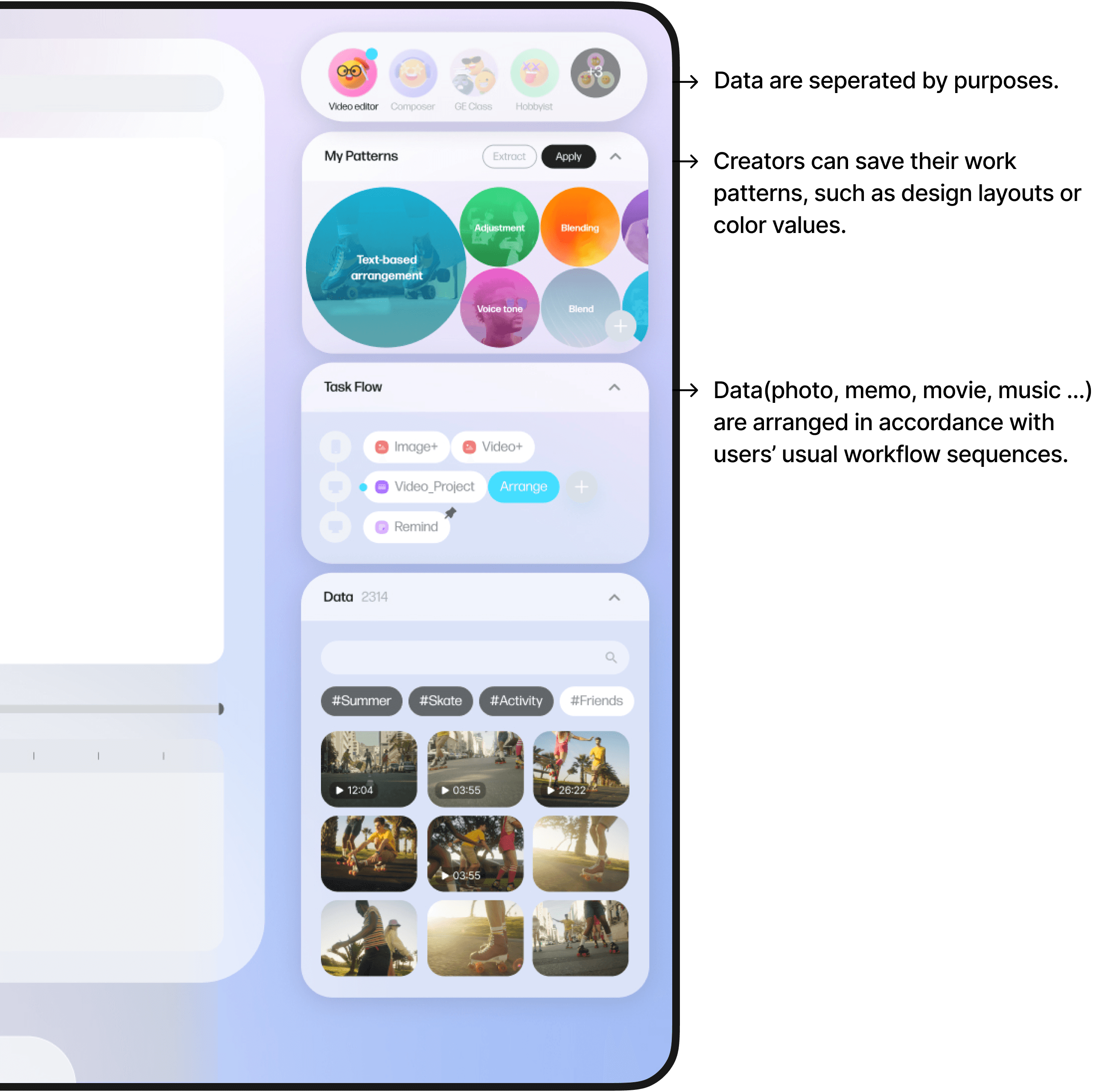 Digital creators often work on multiple things at the same time — e.g uploading vlogs as a YouTuber while also working on a school project with classmates. This data is usually saved freely, without a clear purpose or structure.
