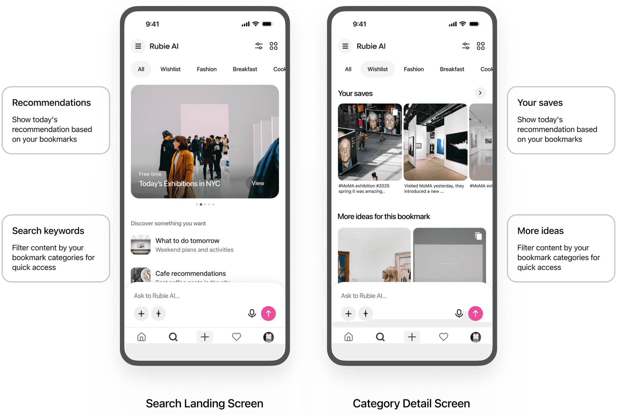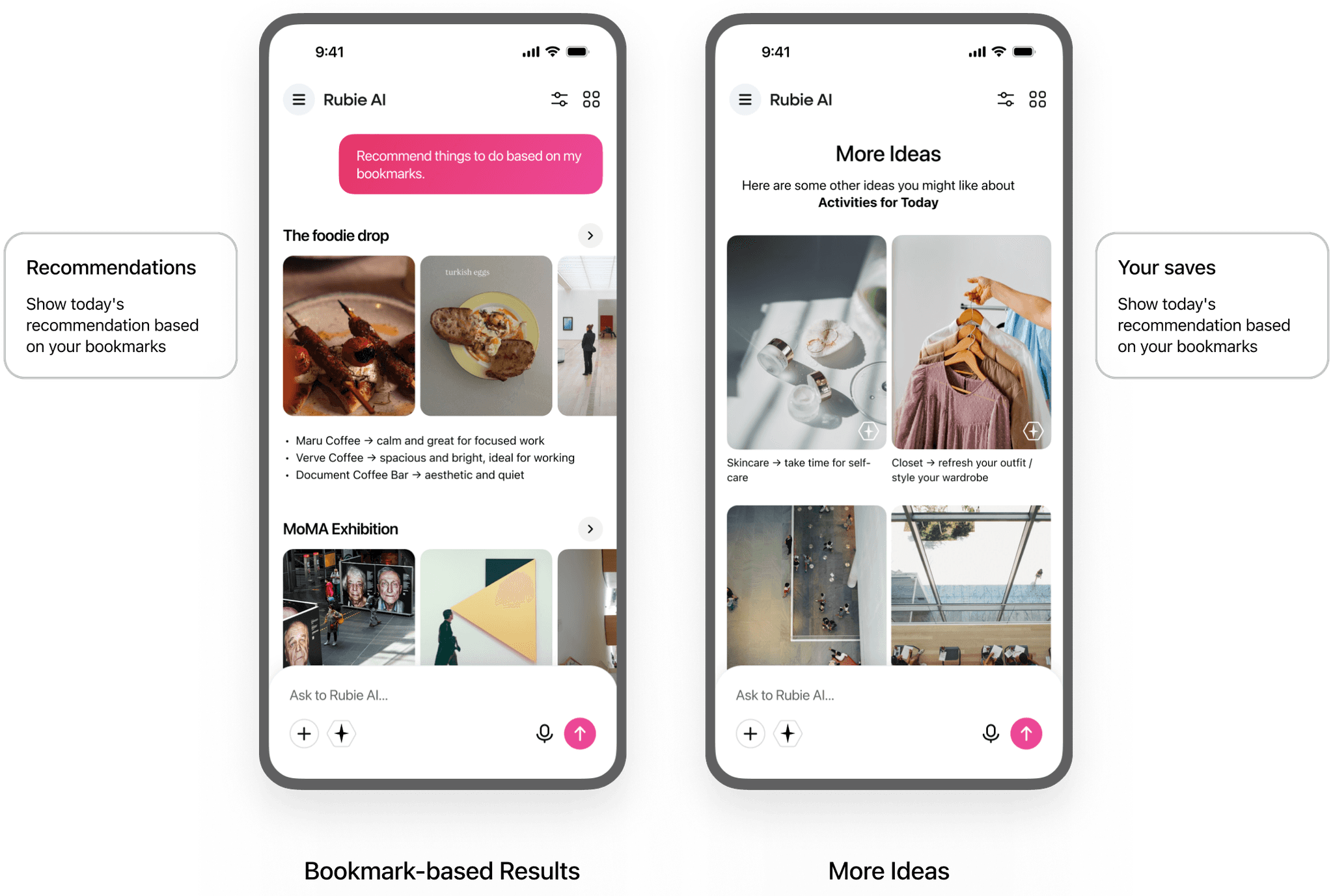 Bookmarks are mostly daily-life curation — cafés, recipes, fashion. The kind of content people ask a friend about, not type into a search bar. Chat UI fits — retrieval feels less like a lookup, more like asking someone who knows your taste.