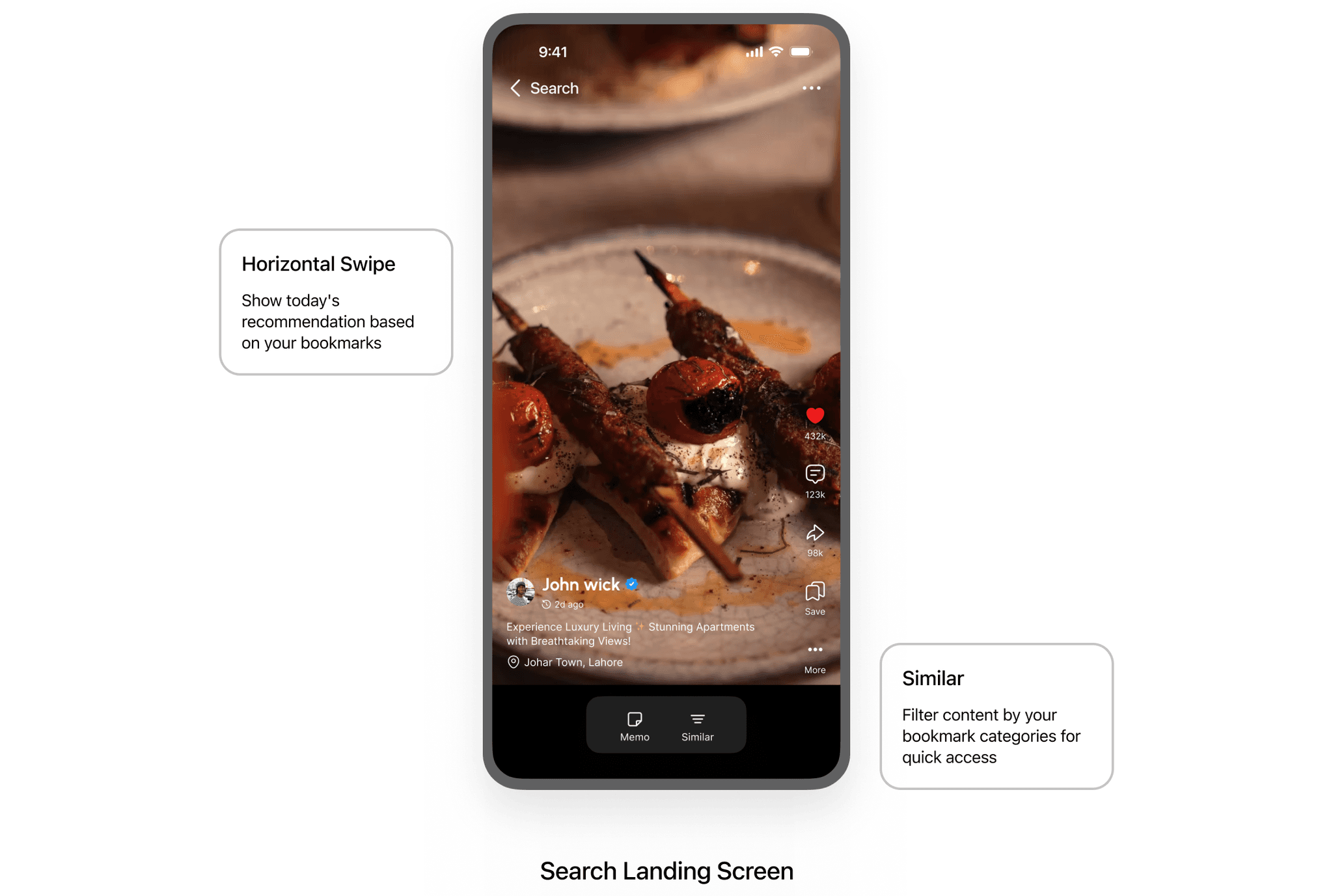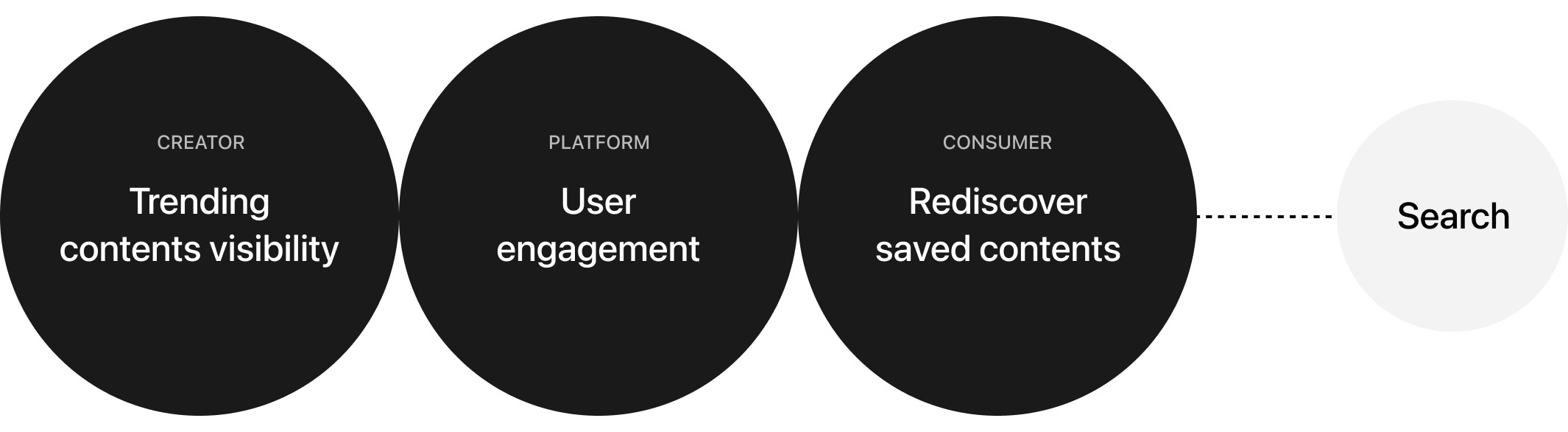 Trending content serves creators and platforms — visibility for new work, engagement for the business. But users' saves stay locked in a separate folder, invisible the moment they start searching. A system that works for everyone except the person searching.