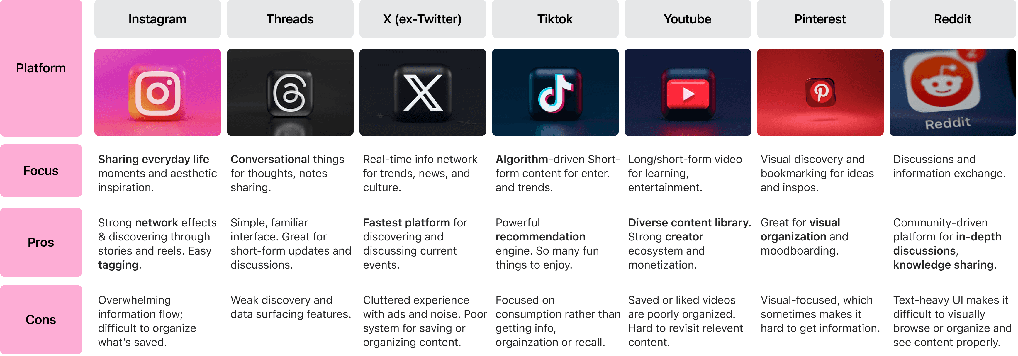 I audited seven platforms — Instagram, Threads, X, TikTok, YouTube, Pinterest, Reddit — to see how each handles saved content. Across all of them, the saved tab sits apart from search. Rediscovery becomes a separate task instead of part of the flow.